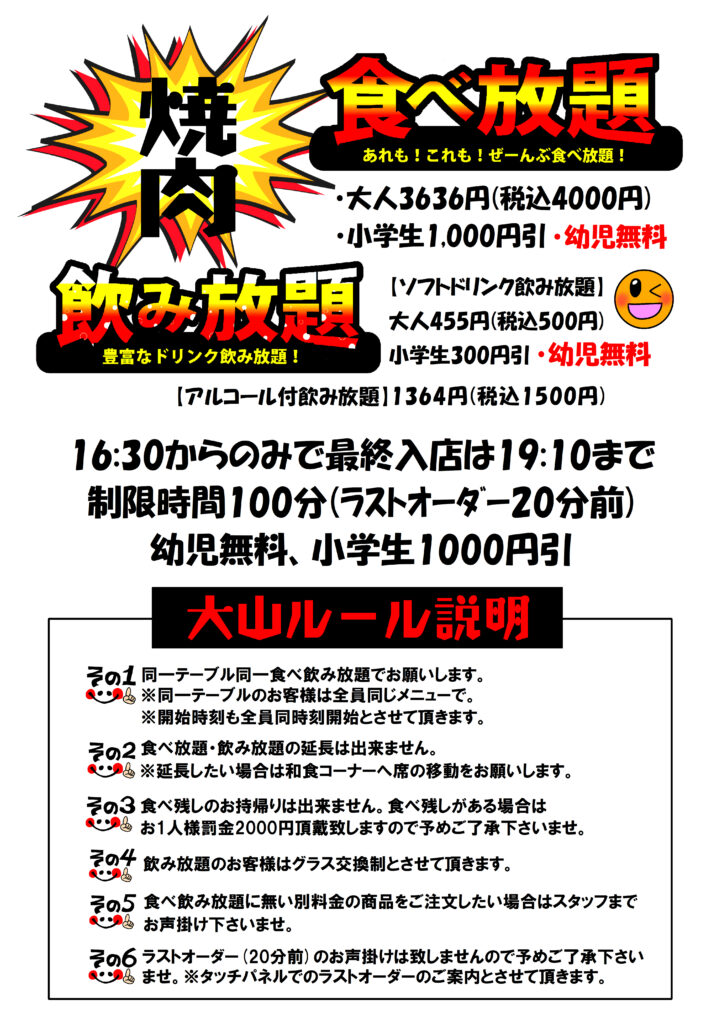 3周年イベントでご好評頂いた焼肉食べ放題プランを通常のディナータイム16:30からではございますが続行する事と致しました!(繁忙期除く) 食べ放題のお肉にはいけだ牛をはじめ国産のお肉も含まれております!焼肉食べ放題100分(ラストオーダー80分)コース!(食べ放題には大山ルールがございますのでご注意下さませ。)小学生1,000円引き・幼児無料!
