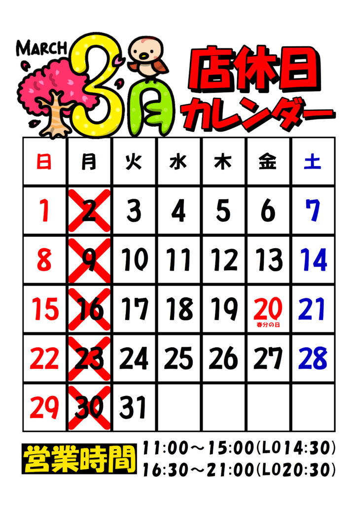 基本、月曜日店休日ですが祝日の場合は営業致します。また振替で火曜日がお休みとなる場合がございますので、ご確認の上ご来店宜しくお願い申し上げます。なお、お電話の受付は当日10:00より行っております。(0134-62-4274)